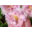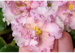 Крупные полумахровые и махровые волнистые белые звезды с розовыми тенями и желтым глазком.