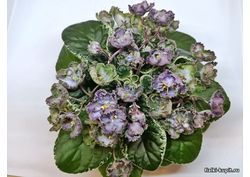 Крупные синие звезды с бело-розовым фэнтези и волнистым розовым краем лепестков. Компактная розетка из темно-зеленой листвы с кремовой пестролистностью.