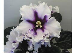 Простые белые звезды с чернильным сине-фиолетовым крупным глазком, поверх глазка отчетливые светло-розовые штрихи, листья темно-зеленые формируют красивую выставочную розетку. Цветение обильное и долгое.