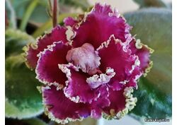 Крупные махровые бахромчатые цветы рубинового цвета, зеленоватая бахромка. Красивый тёмно-зелёный пестролистник из пушистых зубчатых листьев с широким кремовым краем