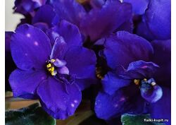 Огромные (7см) волнистые белые цветы с сине-голубой обводкой в центре цветка. Выставочный тёмно-зелёный пестролистник из овальных листьев с лилово-кремовыми краями. Пышное цветение на крепких цветоносах.